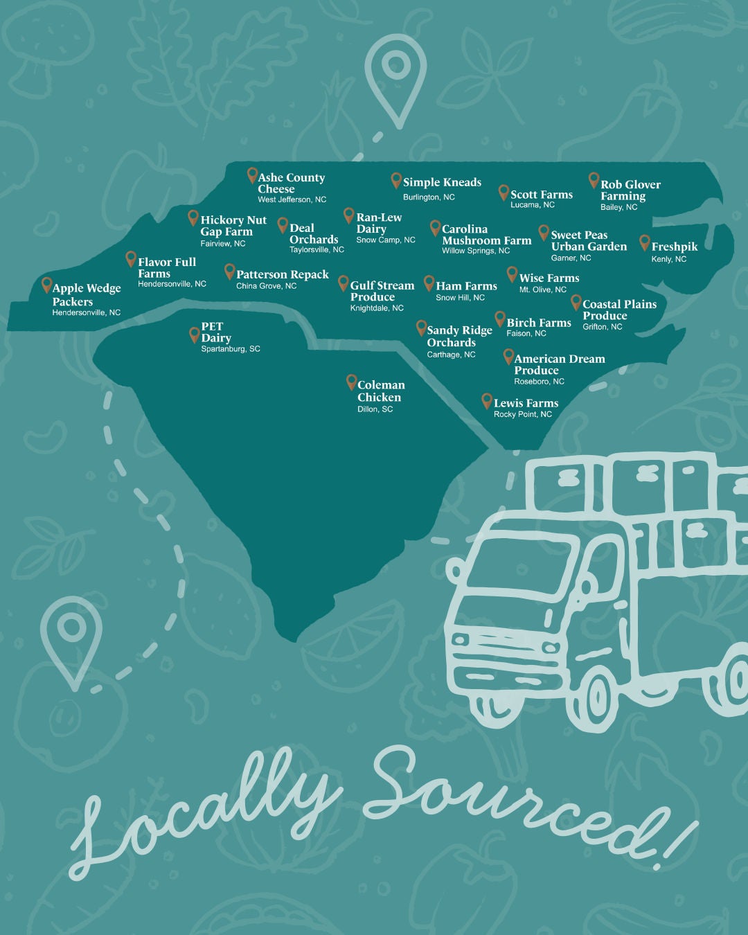 CCU Food Crew sources food from many local farmers, growers, and distributors. Our partners change throughout the year depending on seasonality and availability.
